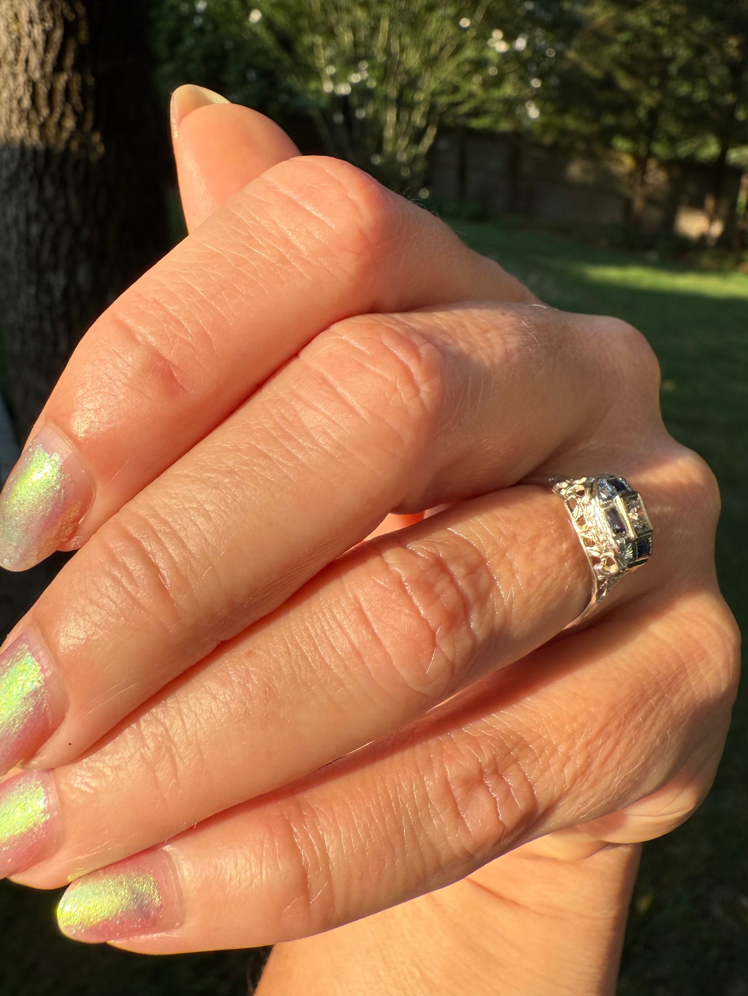 Stange Co. Antique Blue Sapphire Diamond White Gold Art Deco Circa 1920s Cocktail Ring