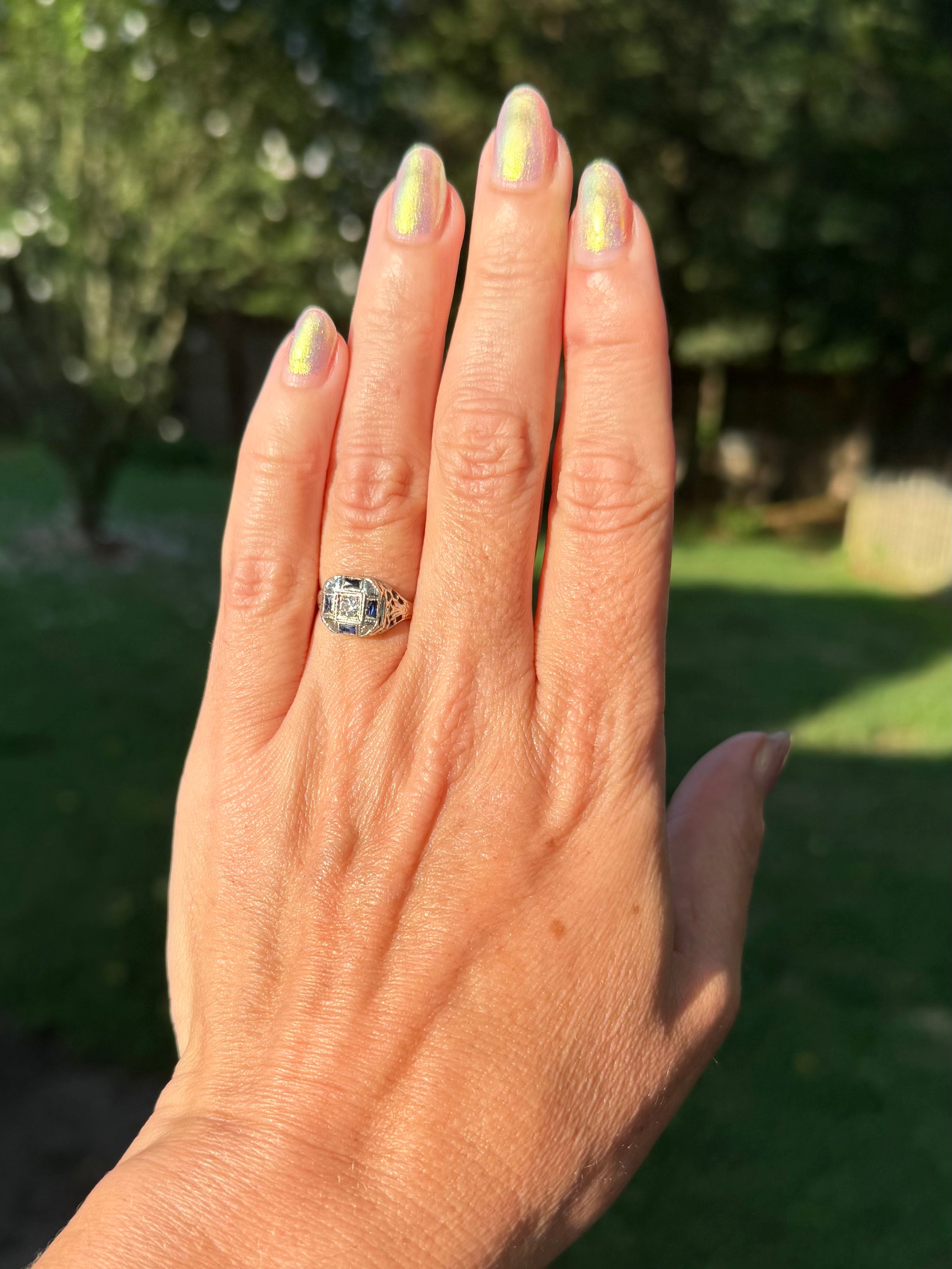 Unique antique diamond and sapphire ring with an octagonal-shaped domed ring front. Four rectangular French cut blue sapphires surround a sparkling old European cut center white diamond. The 14k white gold setting is accented with hand-engraved palm leaves, milgrain, and openwork on the shoulders. Stamped with Stange Co. hallmark of an ornate letter S in a square cartouche. Further stamped 14K. Center diamond approx. 3.1mm diameter, 0.15ct, I, SI2. Weighs a total of 2.1g. Size 6.